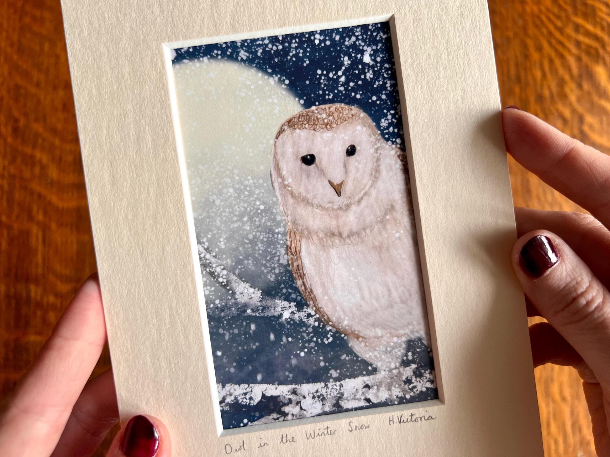 ✨ Capture the quiet magic of a winter’s night with this celestial barn owl art print and matching starry rabbit greeting card. The mounted print features a dreamy illustration of a barn owl perched beneath a glowing full moon and a star-filled, snowy sky. It’s paired with a greeting card that shows a rabbit sitting peacefully in a snowy field beneath a night sky painted with shades of blue, green, and purple — echoing the colours of the Northern Lights. A perfect gift for nature lovers, winter birthdays, or anyone drawn to woodland animals and night-time wonder. ✨