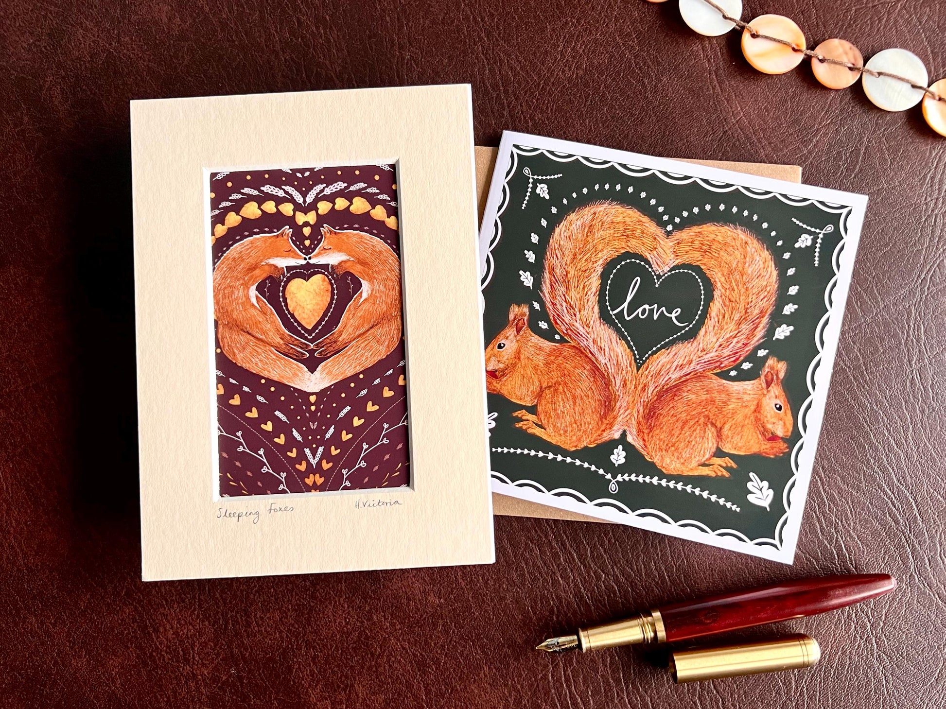 Sleeping Foxes Art Print & Red Squirrels ‘Love’ Card – Unique Woodland Gift Set for Partner