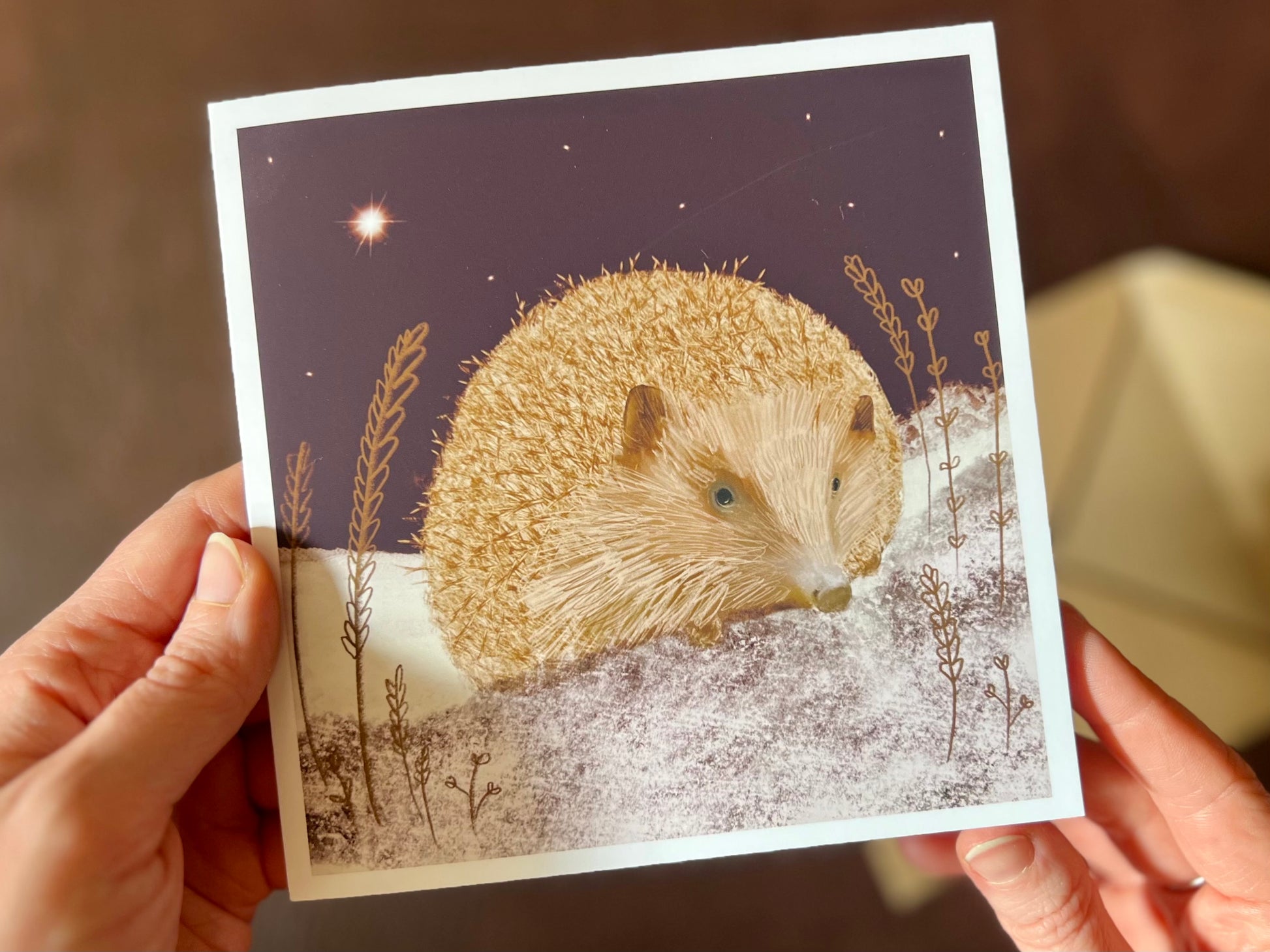 Hedgehog in the Snow Greeting Card – Winter Night Illustration – Unique Christmas Card by Yorkshire Artist