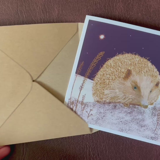 Bring a touch of woodland wonder to your winter greetings with this Hedgehog in the Snow Greeting Card, featuring my original illustration of a hedgehog beneath a dark maroon night sky, lit by a shining star. The scene captures the quiet magic of winter nights, perfect for animal lovers, nature enthusiasts, or anyone who enjoys a touch of Christmas warmth.