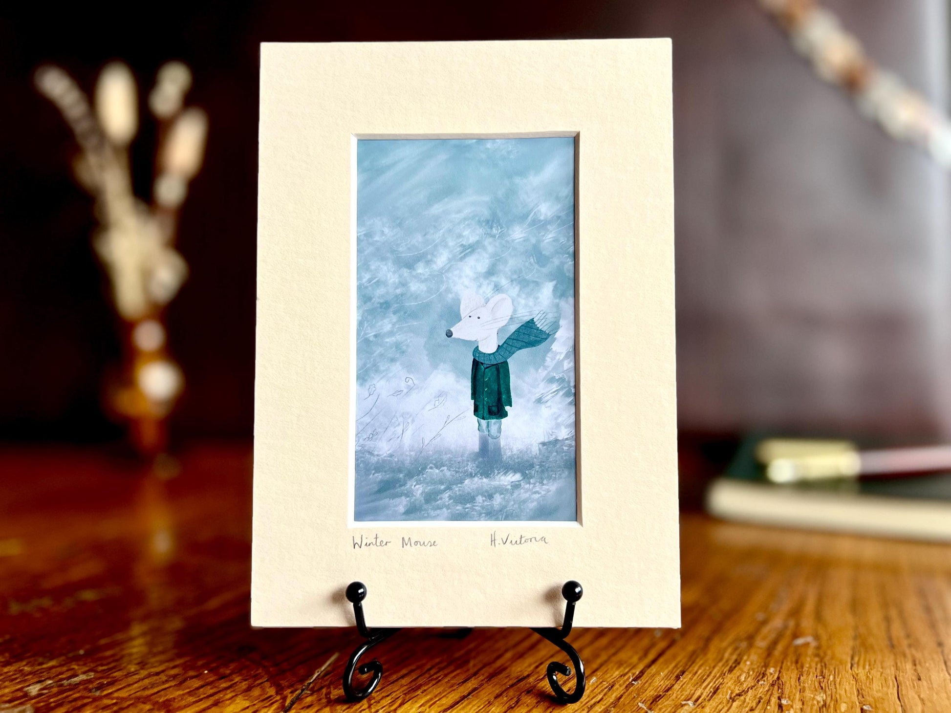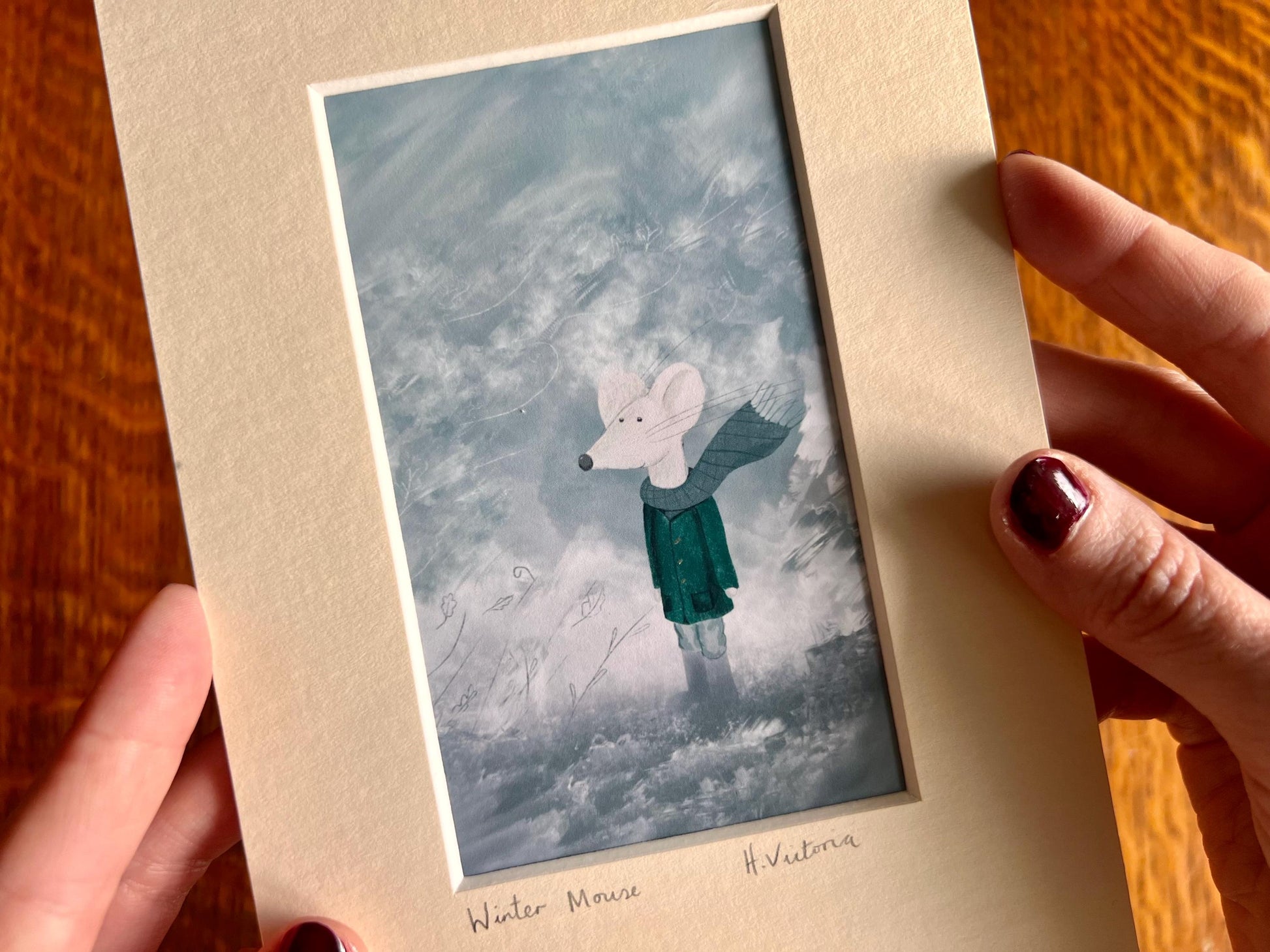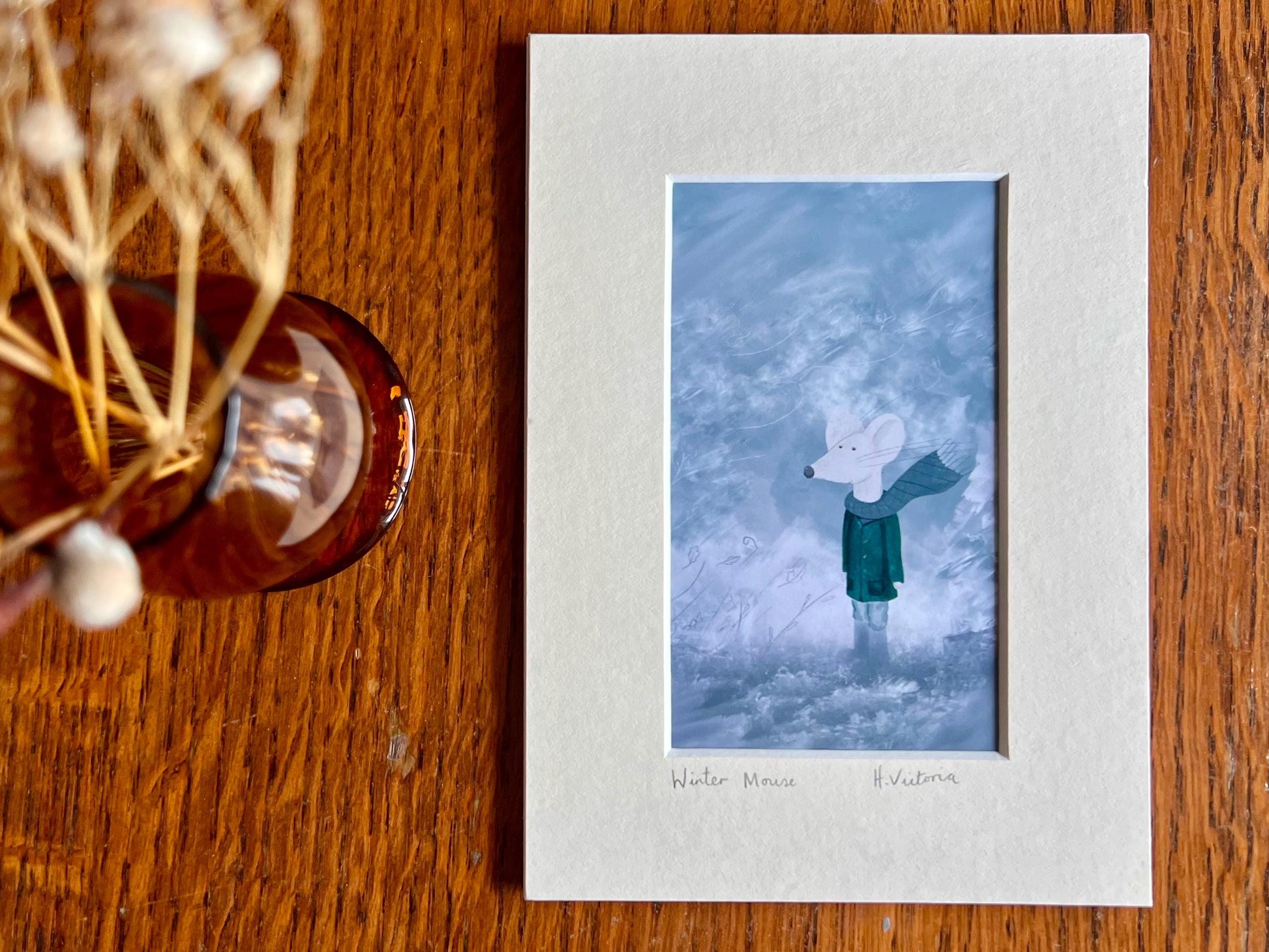 ✨ This small art print features an illustrated mouse wrapped in a cozy coat and scarf, braving a blustery blue winter’s day. Full of charm and seasonal spirit, it makes a thoughtful gift for animal lovers, fans of whimsical art, or anyone in need of a little winter warmth. Perfectly sized and mounted in a 5”x7” mount for easy display, it adds a gentle, storybook-like touch to any space. ✨