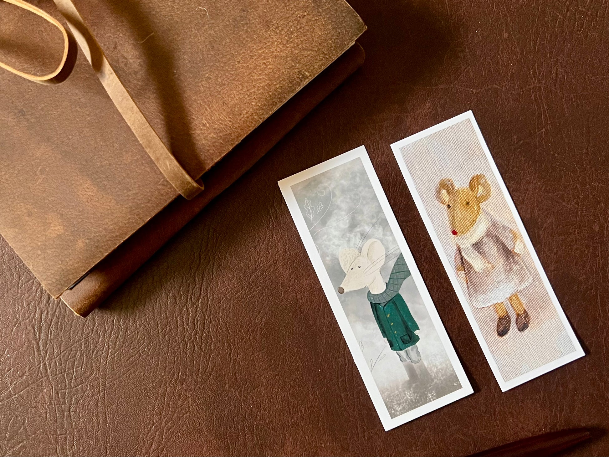 This charming pair of handmade mouse bookmarks brings together two complementary designs - one whimsical, and one painterly - both celebrating the gentle beauty of tiny mice.