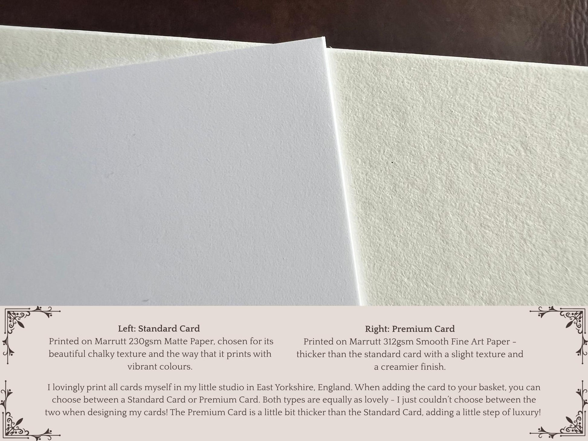 - Premium Card: printed on luxurious 312gsm Fine Art Paper - also matte, but thicker with a high quality, slightly textured feel and a creamy, white finish.