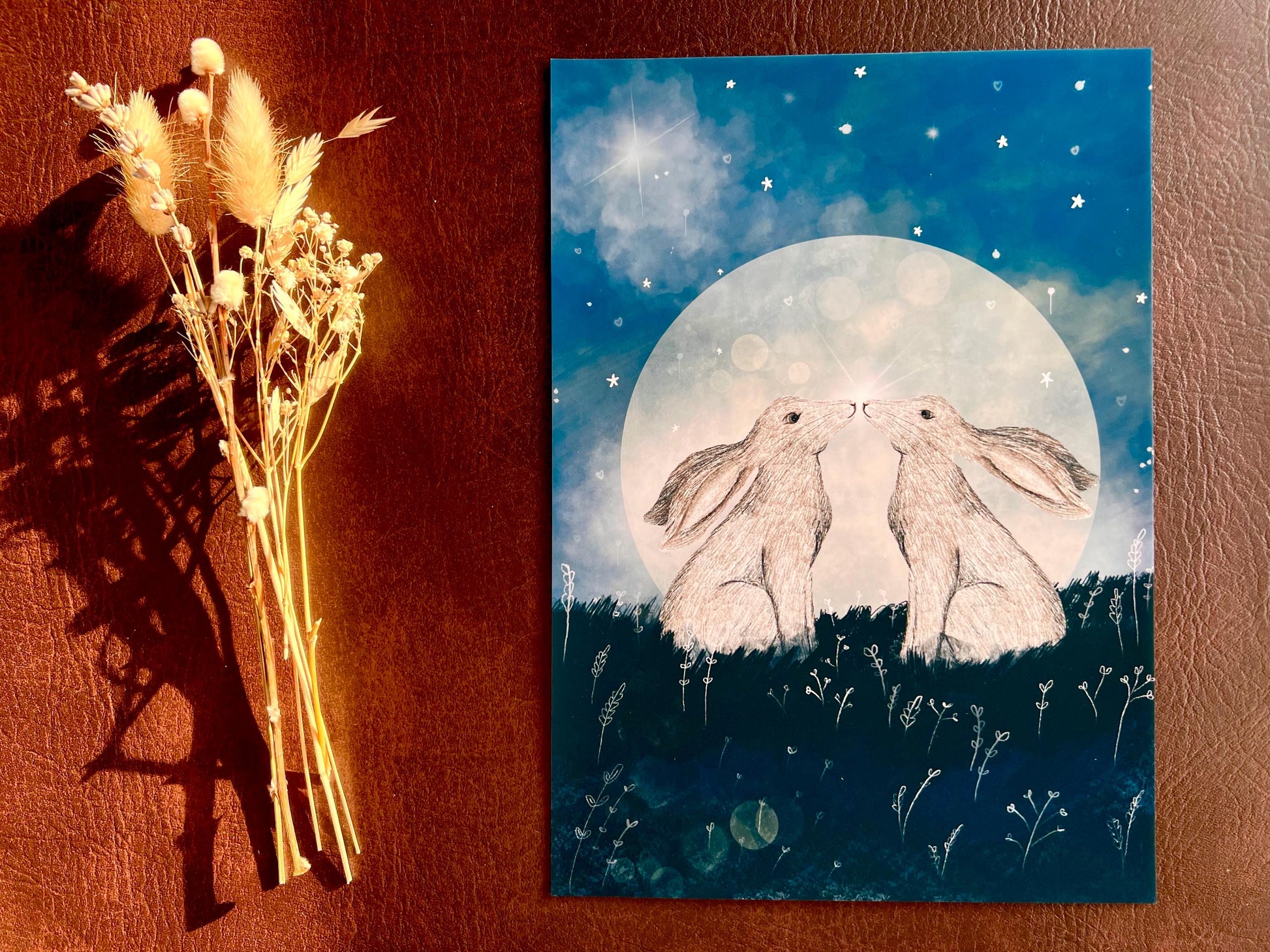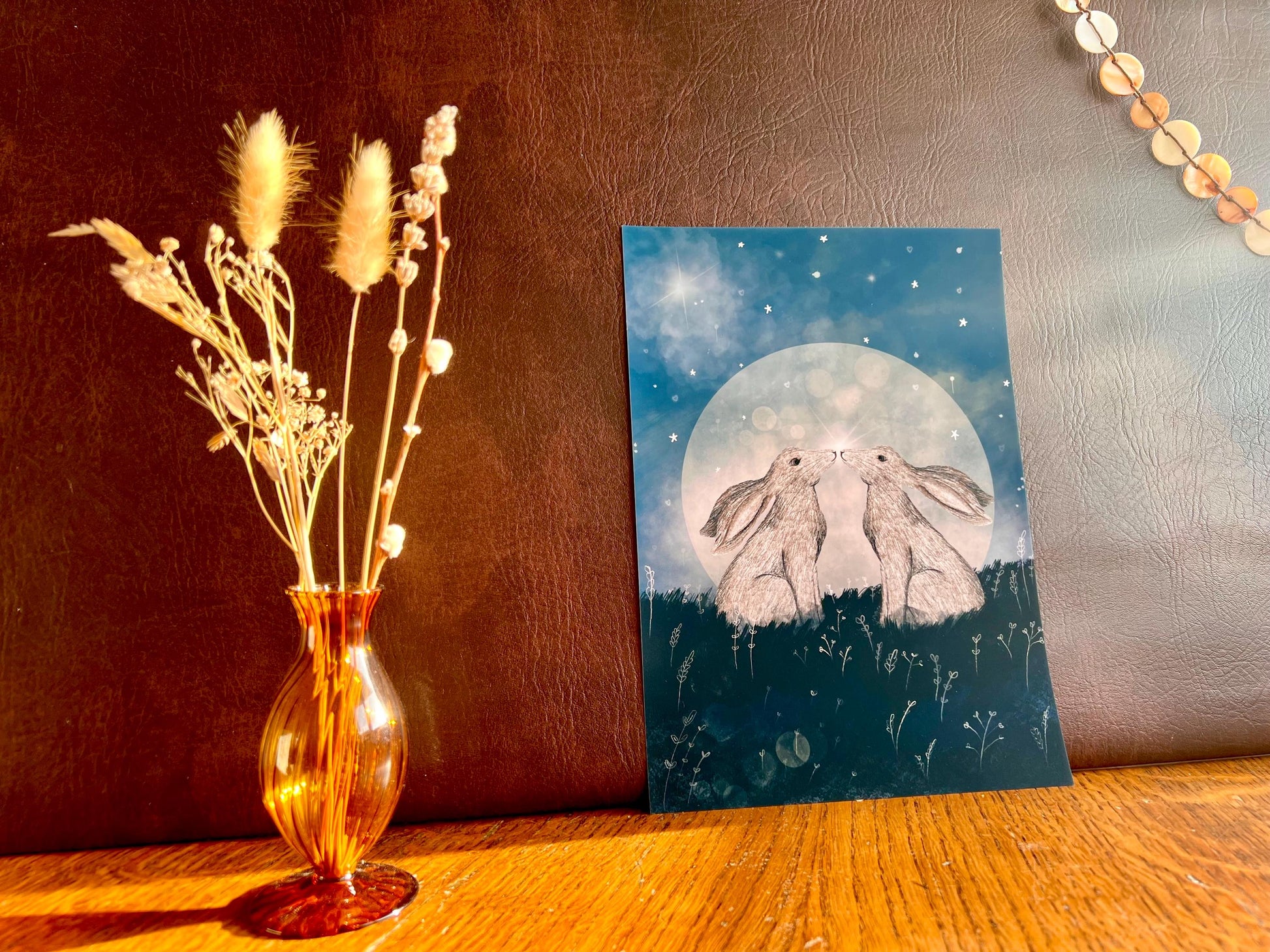✨ This striking art print features two white hares facing each other nose-to-nose beneath a glowing full moon, set against a deep, celestial night sky. The symmetrical composition and lunar backdrop give this piece a sense of mystery, magic, and balance. Perfect for spiritual or mystical interiors, this artwork adds a thoughtful, symbolic touch to any space and makes a meaningful gift for nature lovers or moon gazers. ✨
