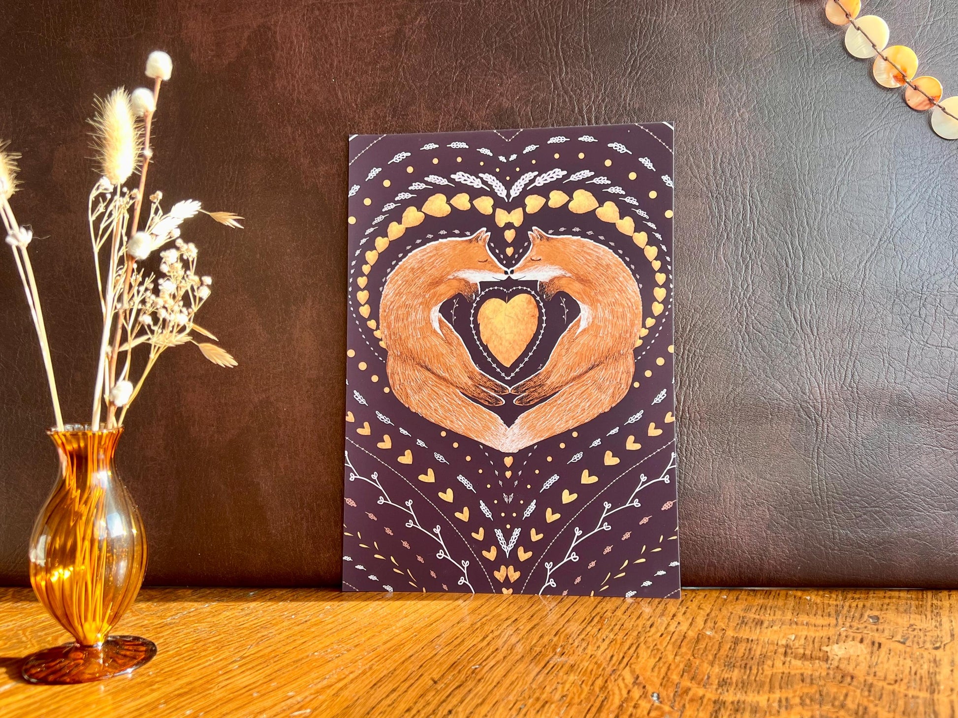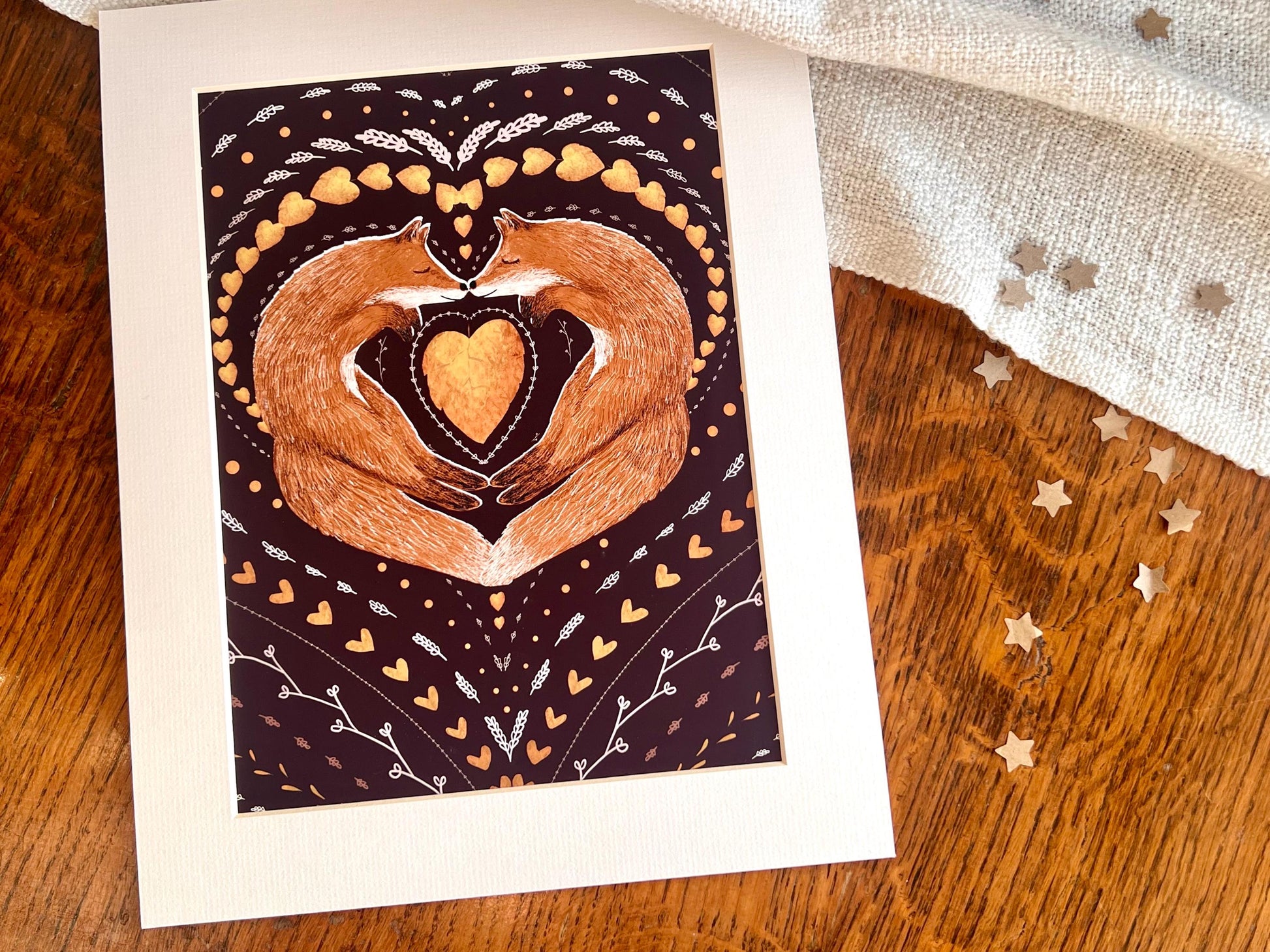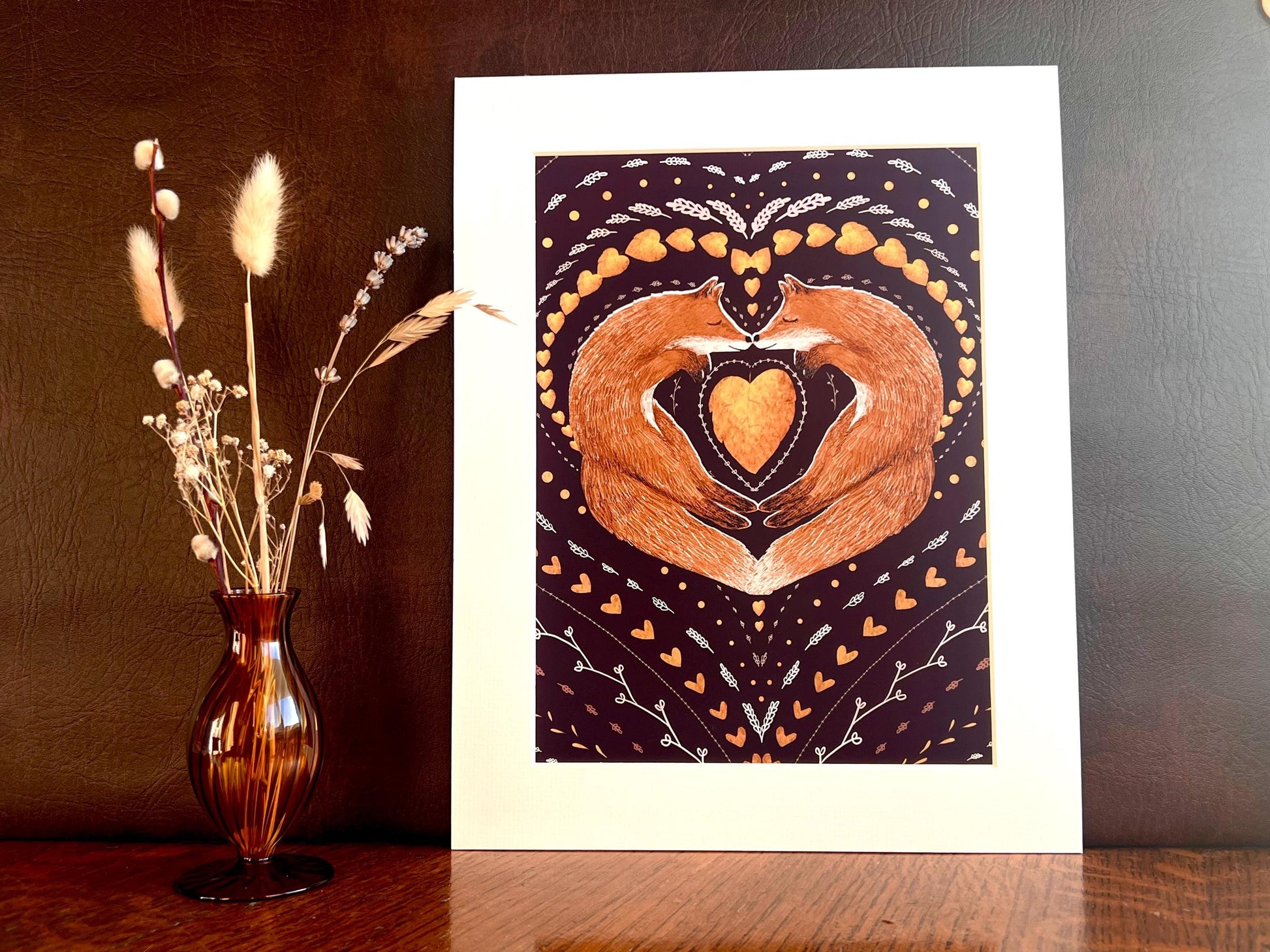 ✨ This unique art print features my illustration of two sleeping foxes, curled together in a heart-shaped pose and surrounded by heart-shaped leaves in a symmetrical folk art pattern. Inspired by Nordic and Scandi design, the deep maroon background adds warmth and richness to the piece. Symbolising companionship and calm, this print makes a thoughtful gift for a friend or partner, or a distinctive addition to your home decor. ✨