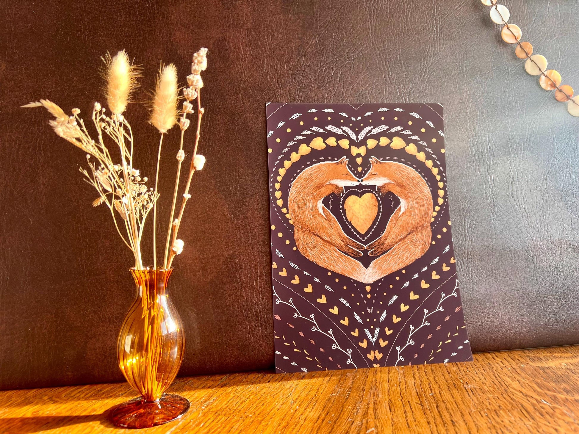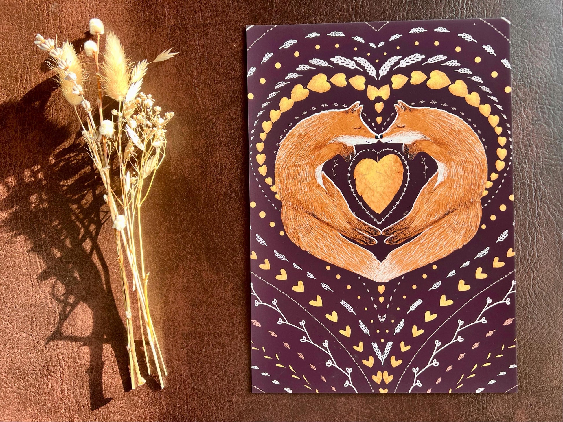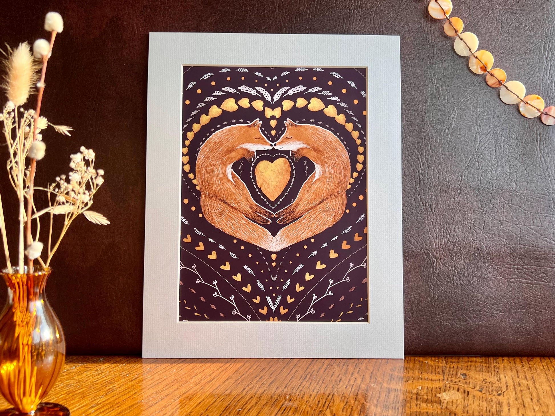 ✨ This unique art print features my illustration of two sleeping foxes, curled together in a heart-shaped pose and surrounded by heart-shaped leaves in a symmetrical folk art pattern. Inspired by Nordic and Scandi design, the deep maroon background adds warmth and richness to the piece. Symbolising companionship and calm, this print makes a thoughtful gift for a friend or partner, or a distinctive addition to your home decor. ✨
