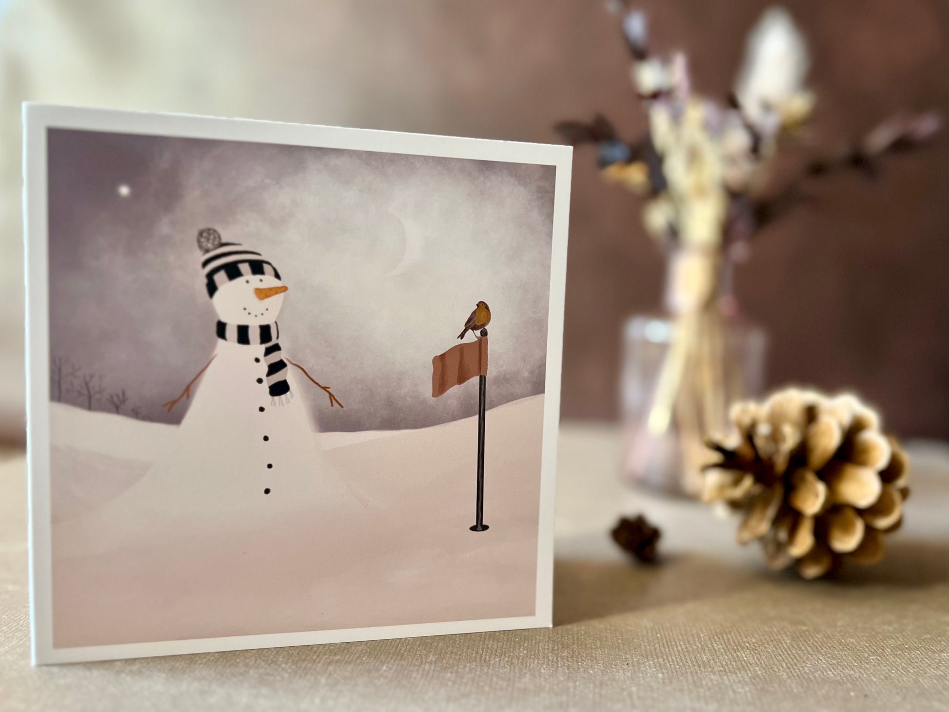 Bring festive cheer to golf, rugby and football fans with this charming illustrated Christmas card. Featuring a friendly snowman next to a golf flag, topped with a cheerful robin, and set against a soft lilac-grey winter sky, this card is designed for sports fans and Christmas lovers alike. The snowman wears a woolly hat and scarf that can be customised to match your favourite team colours - perfect for football, rugby, or golf fans!