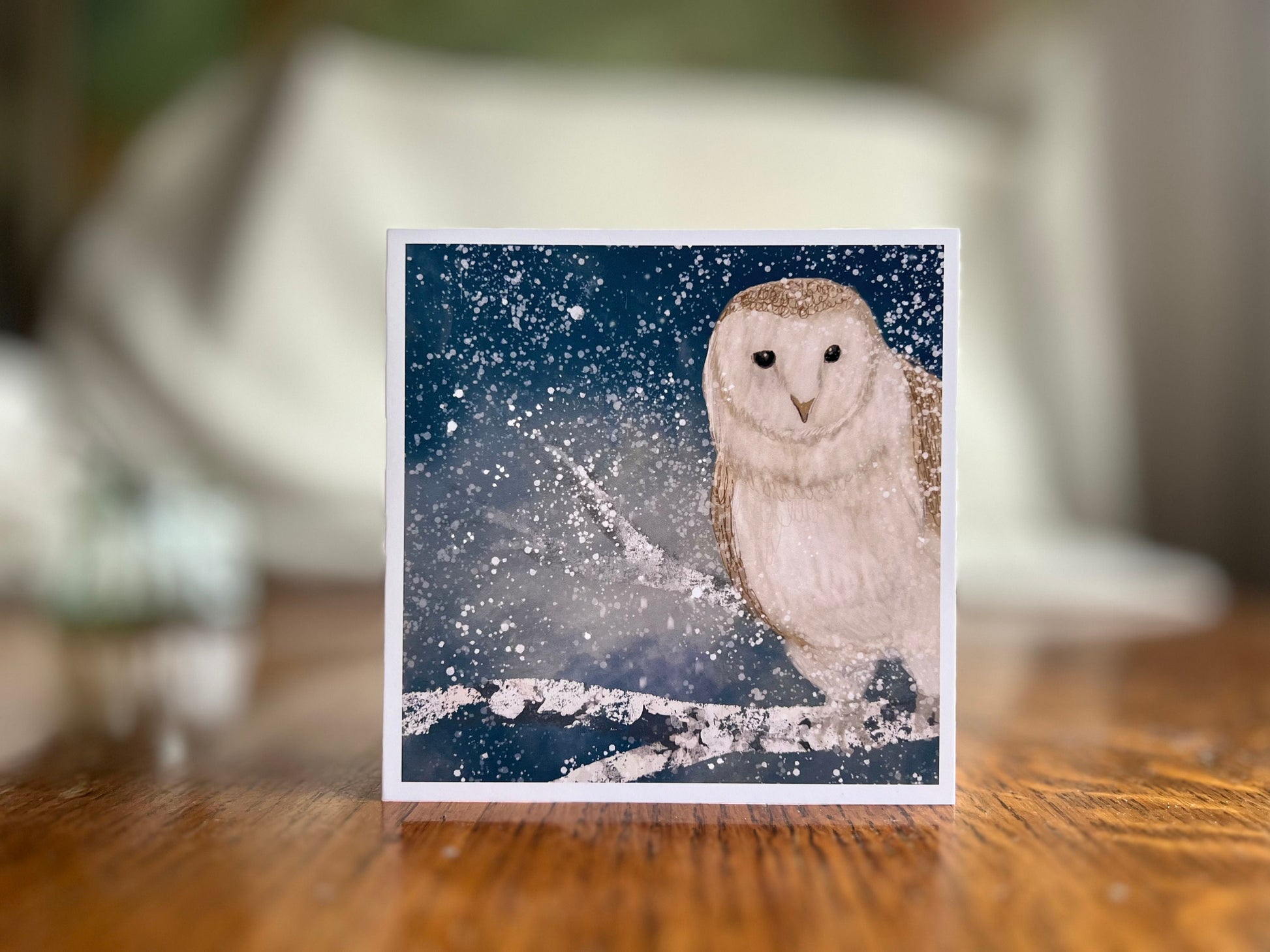 ✨ Celebrate the magic of the British winter with this beautifully illustrated barn owl greeting card. Featuring a serene, snowy nighttime scene, this barn owl art card is perfect for Christmas greetings, winter notes, or simply keeping in touch with loved ones during the colder months. ✨