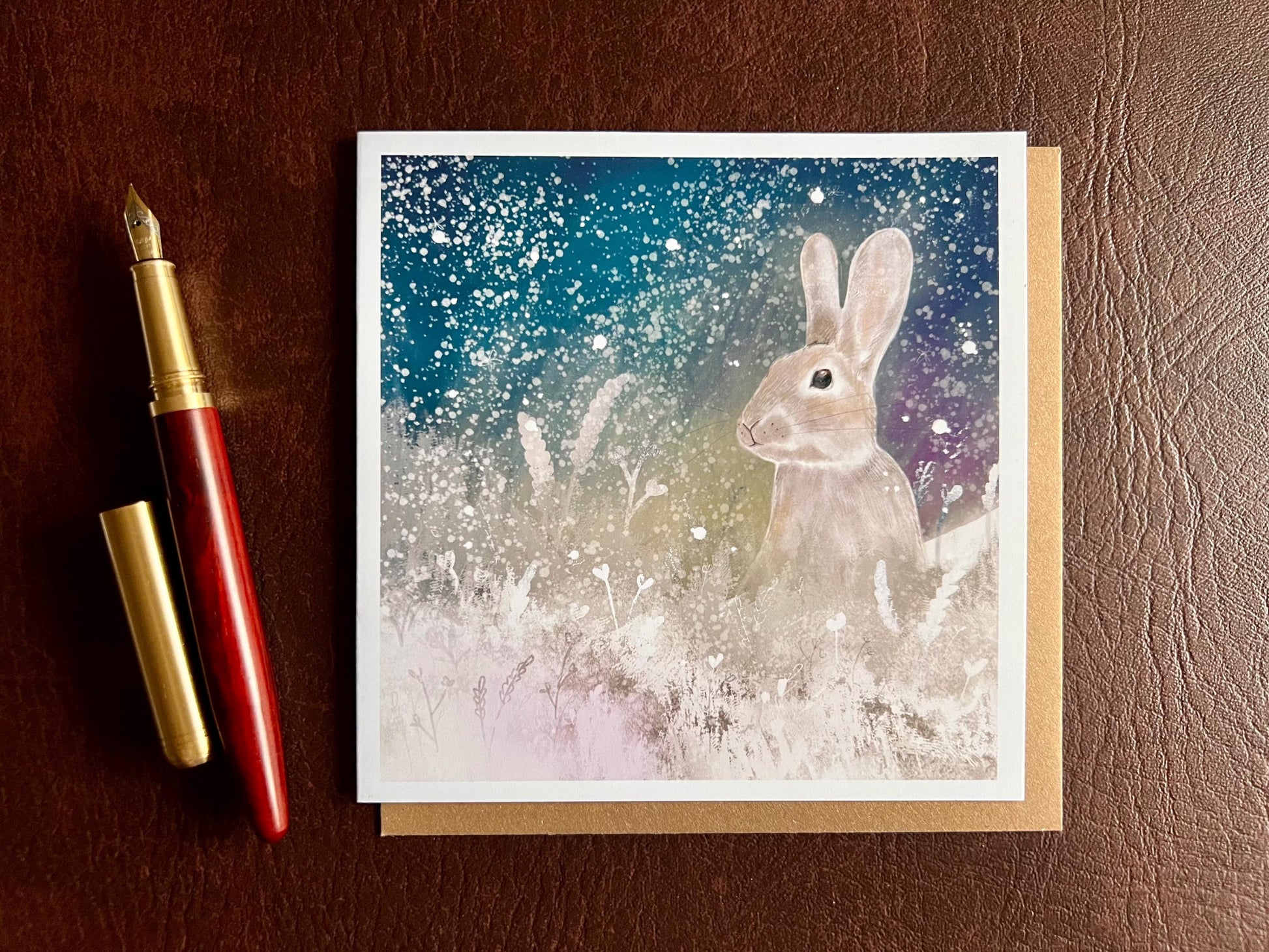 ✨ This celestial rabbit greeting card features an ethereal illustrated design, with a starry sky and Northern Lights colours, giving a sense of quiet magic and spiritual connection. Perfect for those drawn to lunar symbolism, nature-based spirituality, or simply the beauty of the night sky, this card is blank inside for your own heartfelt message. A thoughtful choice for birthdays, keeping in touch, or just because. Featuring a snowy foreground, this is also an ideal choice for a special Christmas card.✨
