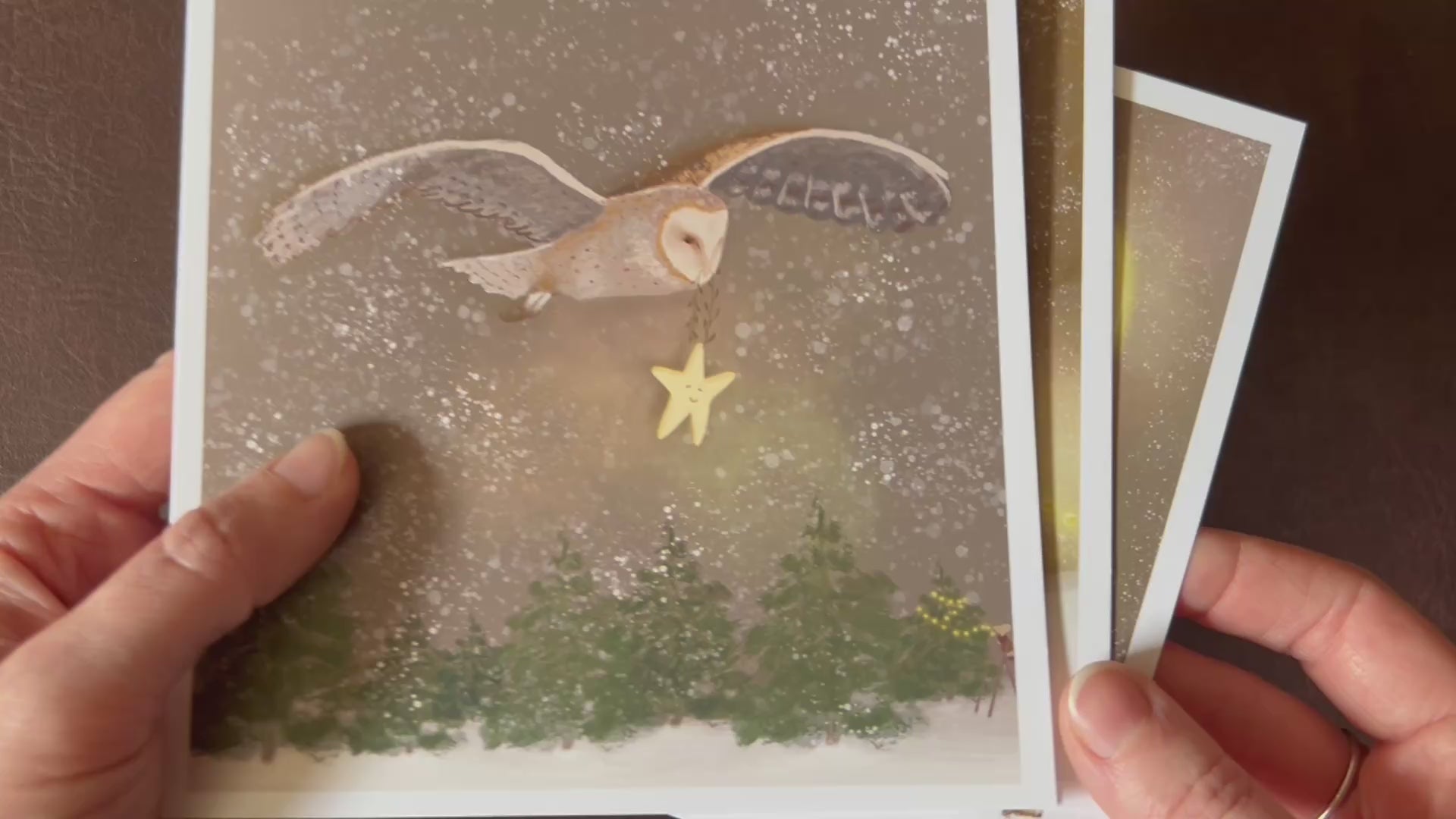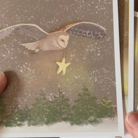 - A barn owl flying over treetops at night, carrying a smiling, shining star.